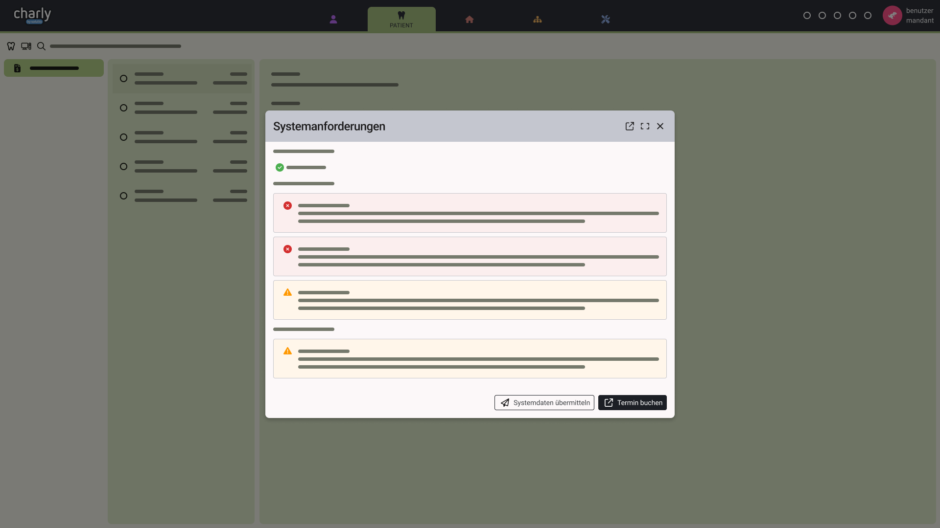 Wenn Sie charly-Web das erste Mal nach dem Update öffnen, erscheint ein Dialog mit dem Titel Systemanforderungen, der die Ergebnisse des Checks anzeigt.