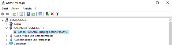 In dem Geräte-Manager erscheint der Barcodescanner unter „Anschlüsse (COM & LPT)“. In dem folgenden Beispiel heißt er „Xenon 1900 Area-Imaging Scanner (COM3)“. Die Bezeichnung „COM3“ ist in diesem Fall der COM-Port, an dem der Barcodescanner angeschlossen ist.