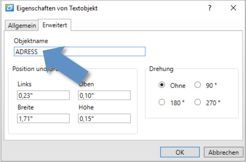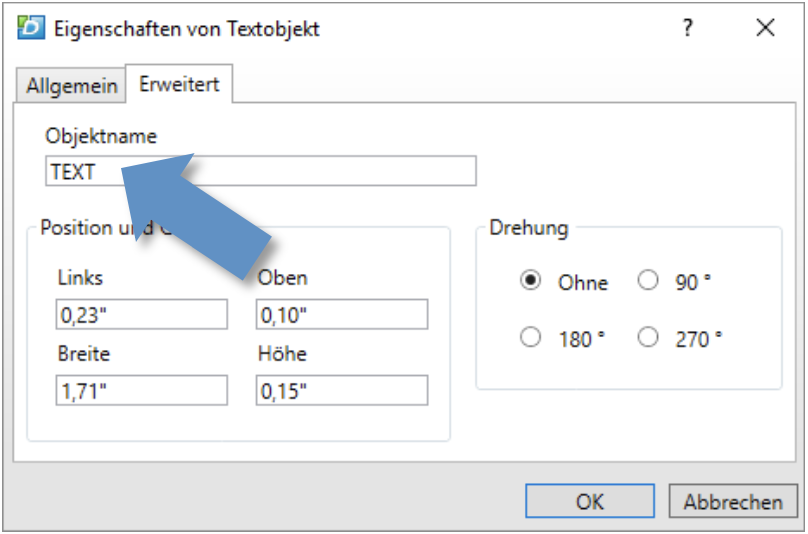 Wählen Sie in dem Fenster den Reiter Erweitert und schreiben Sie in das Feld Objektname folgenden Text (exakte Schreibweise):