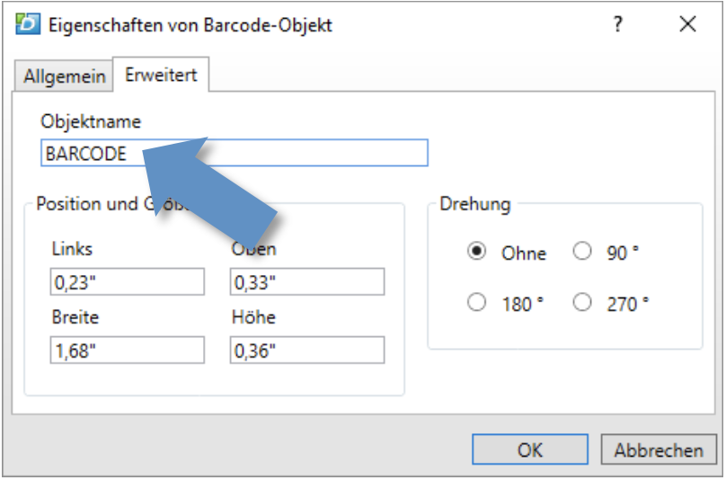 Klicken Sie mit der rechten Maustaste auf das Barcode-Objekt und wählen Sie die Option Eigenschaften.