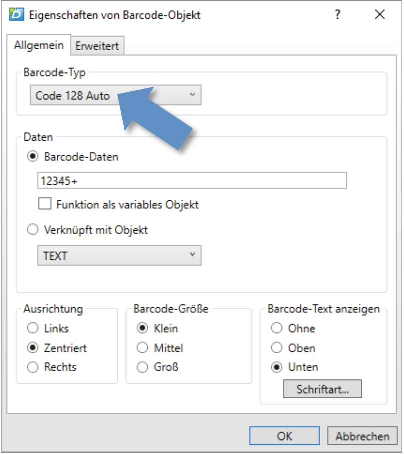 Wählen Sie in dem Fenster den Reiter Allgemein und wählen Sie dort in der Dropdownliste Barcode-Typ die Option Code 128 Auto.