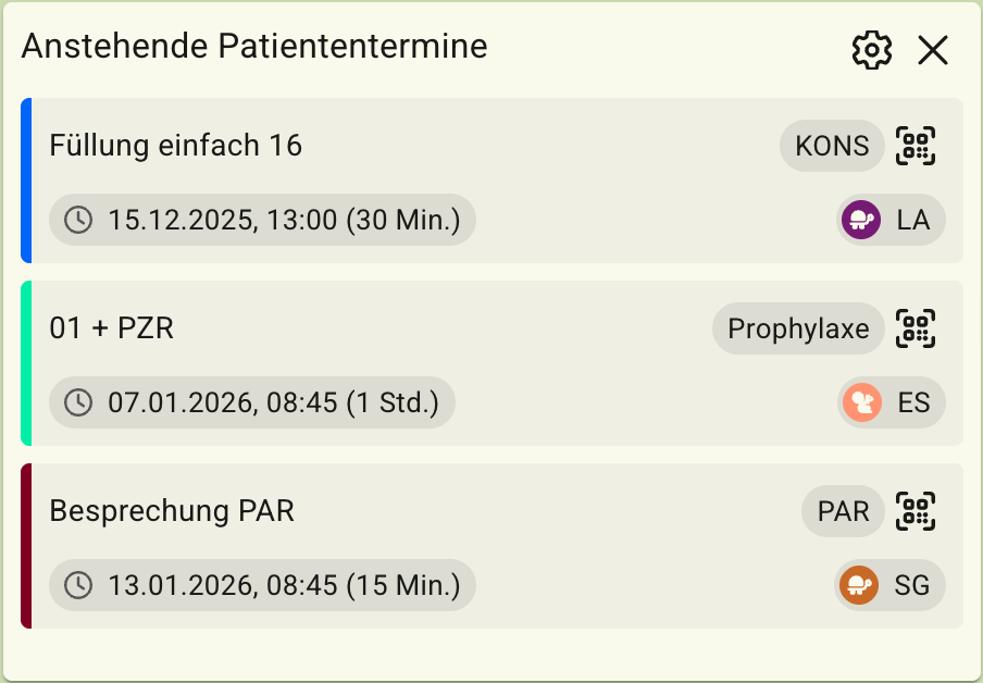 Zeigt anstehende Termine des aktuell gewählten Patienten an. Folgende Informationen zum Termin werden angezeigt: