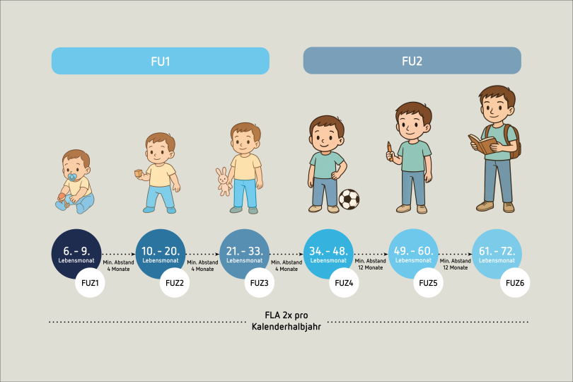 Die Zeiträume bei der FU1 sind identisch geblieben, während nun die drei Untersuchungen innerhalb der FU2 ebenfalls konkreten Zeiträumen zugeordnet sind.